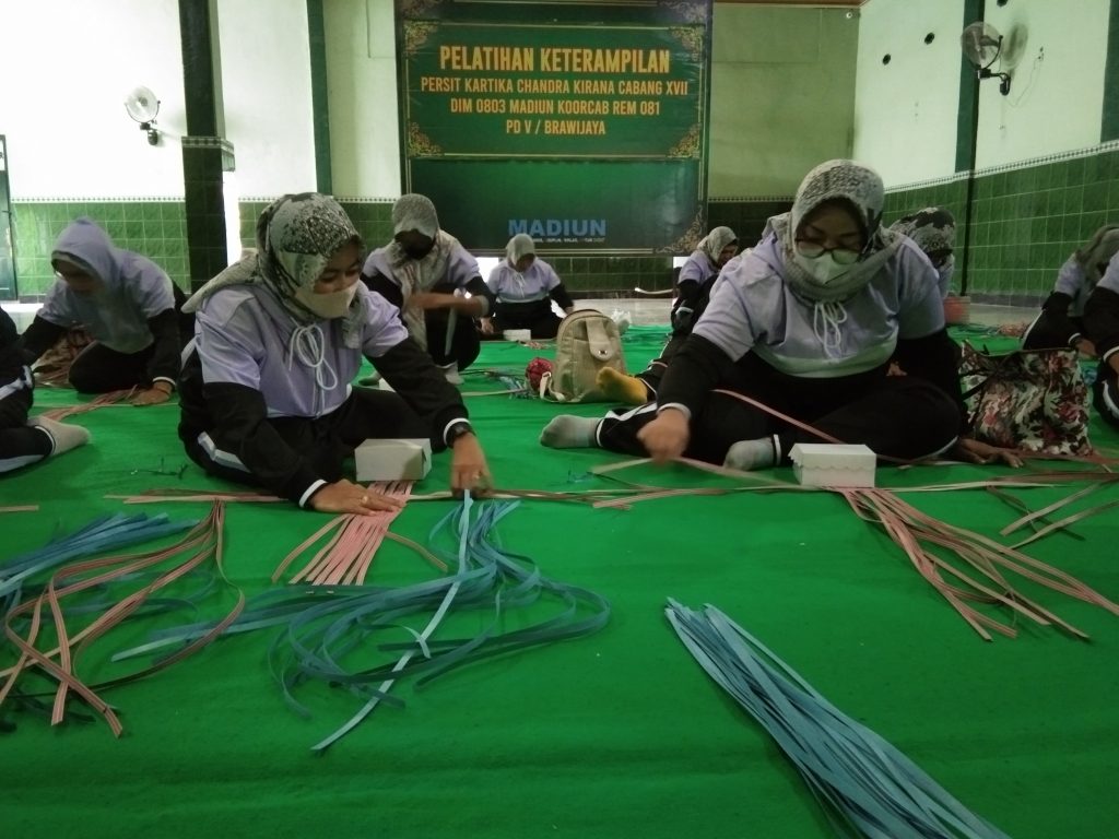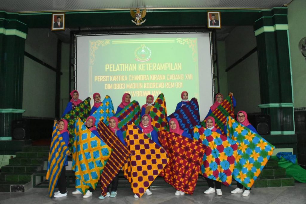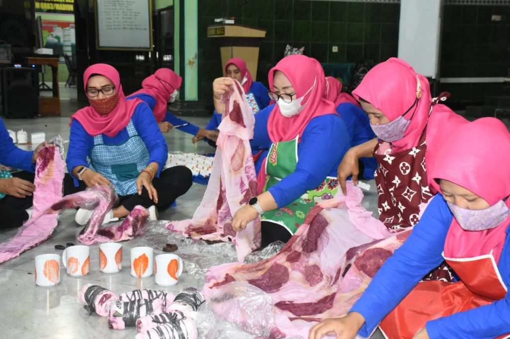 Dengan tetap mengedepankan protokol kesehatan, Ketua Persit Kartika Chandra Kirana Cabang XVII Kodim 0803 Madiun Ny Sisca Edwin Charles bersama anggota persit melaksanakan pelatihan membuat batik dan kerajinan anyaman, Rabu (27/01/2021).