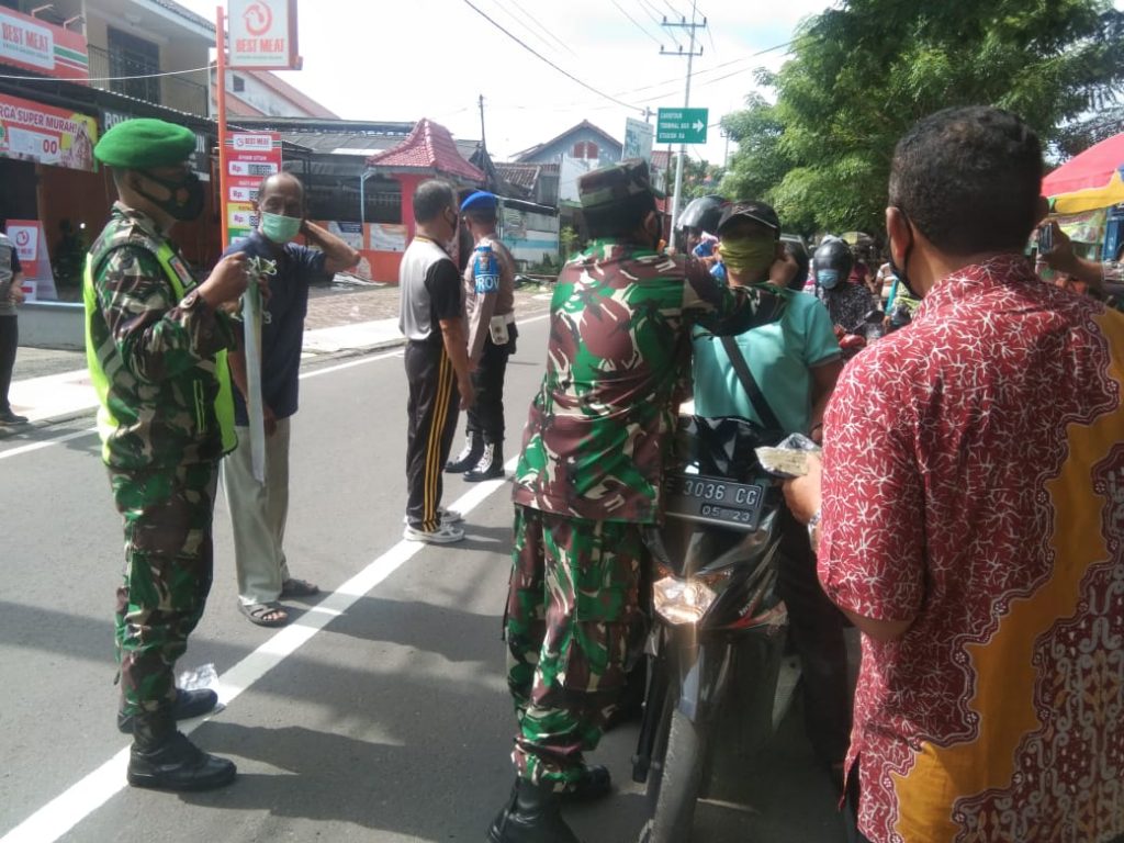 Operasi Yustisi Penegakan disiplin protokol kesehatan yang dipimpin oleh Danramil 0803/15 Kartoharjo Kapten Chb. Loso bersama Camat Ibu Anita maharani, dengan sasaran para pengunjung dan pedagang yang beraktifitas di Pasar Sri Jaya yang masih tidak mematuhi Protokol kesehatan.