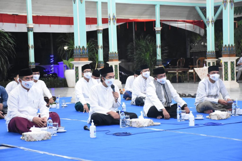 Madiun – Sebagai bentuk ikhtiar batin dalam upaya mencegah penyebaran Covid-19, Forkopimda Kabupaten Madiun menggelar istighotsah kubro secara online. Bertempat di Pendopo Muda Graha, Sabtu malam (17/7). Acara yang dihadiri Bupati dan Dandim 0803/Madiun tersebut disiarkan melalui aplikasi Zoom dan kanal Youtube Pemkab Madiun.