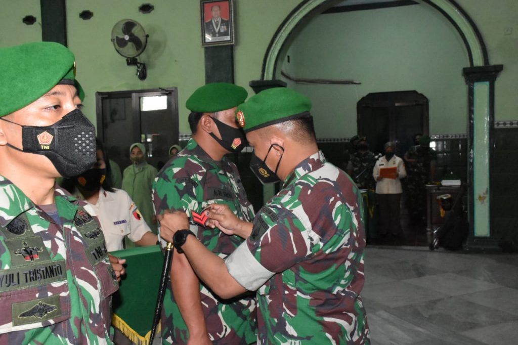 Madiun – Dandim 0803/Madiun Letkol Inf Edwin Charles memimpin upacara Korps Raport Kenaikan Pangkat setingkat lebih tinggi Bintara dan Tamtama, bertempat di Aula Makodim Jl. Pahlawan No.25, Madiun Lor, Kec. Manguharjo, Kota Madiun, Jumat (1/4/2022).