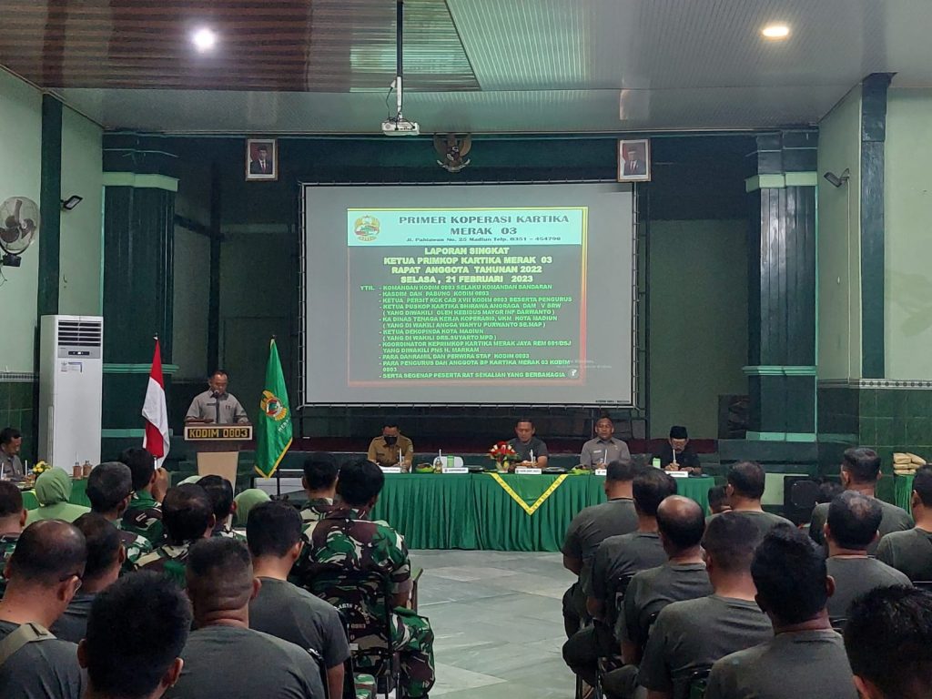 Madiun – Sebagai bentuk pertanggungjawaban terhadap pelaksanaan program kegiatan selama satu tahun dan membahas rencana program kegiatan mendatang, Primer Koperasi Kartika Merak 03 Kodim 0803/Madiun menggelar Rapat Anggota Tahunan (RAT) Tutup Buku Tahun 2022, di Aula Makodim 0803/Madiun, Jl. Pahlawan No. 25 Kota Madiun, Selasa (20/2/2023).