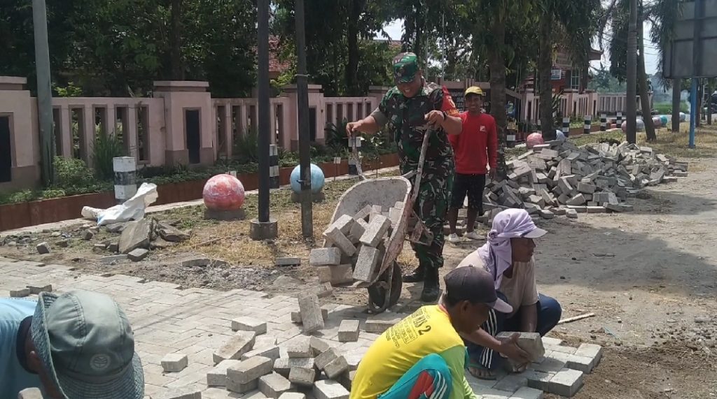 Babinsa Kerja Bakti Bersama Warga Pasang Paving Halaman Balai Desa Kenongorejo.