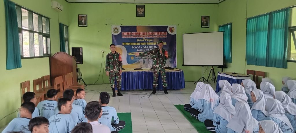 Terkait hal itu anggota Koramil 13/Kebonsari Kodim 0803/Madiun Serda Hariyanto memberikan materi wawasan kebangsaan dan pelatihan PBB kepada siswa-siswi kelas sepuluh MAN 2 Madiun.
