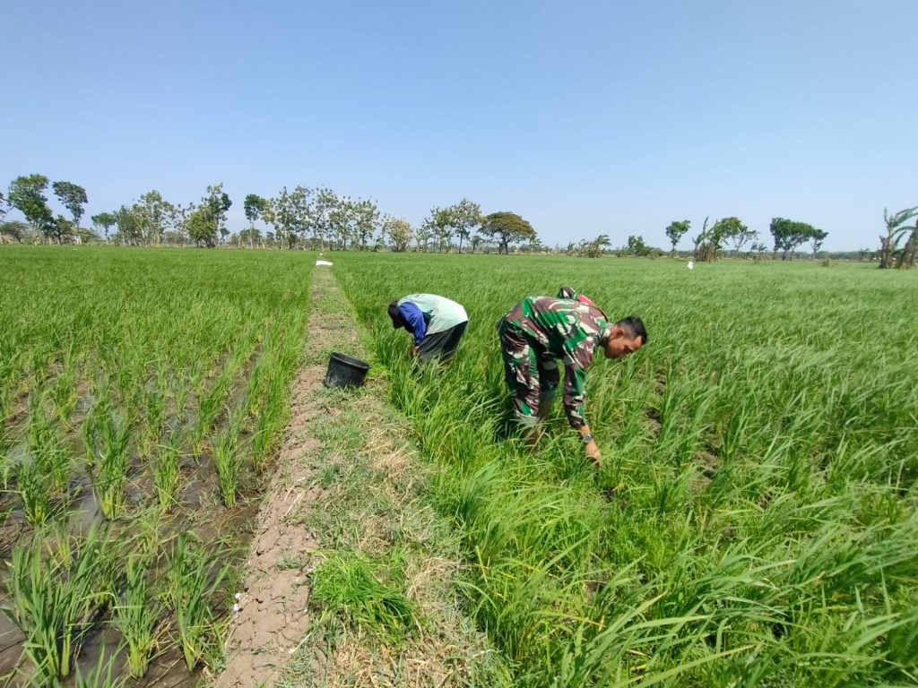 Kendalikan Gulma Tanaman Padi, Babinsa Bantu Petani Lakukan Penyiangan.