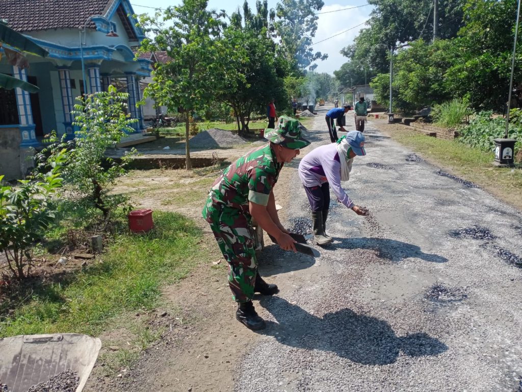 Babinsa Kodim Madiun Bantu Perbaiki Infrastruktur Jalan.