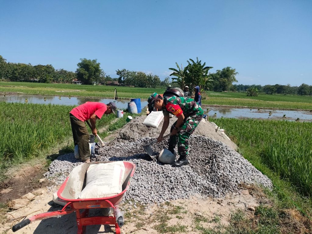 Babinsa Koramil Geger Bantu Warga Bangun Infrastruktur Jalan Sawah.
