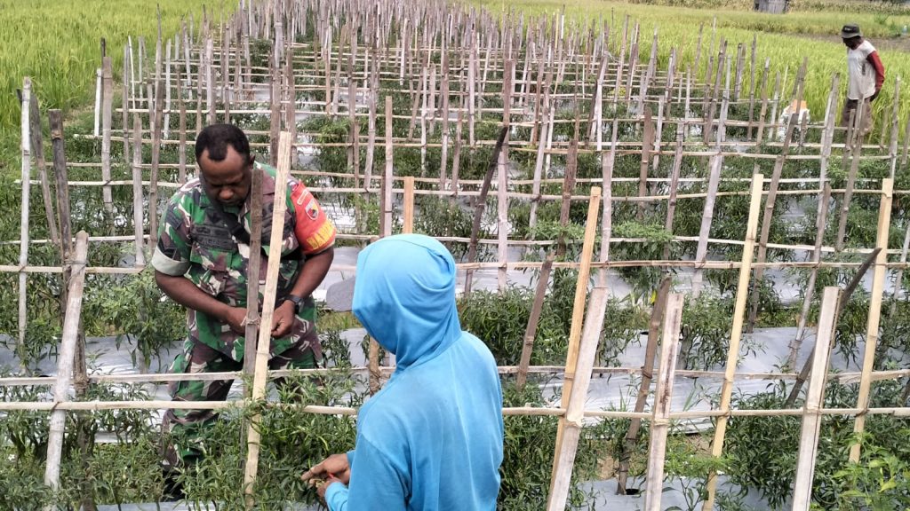Madiun – Dalam rangka menyukseskan swasembada pangan nasional, Babinsa Koramil 11/Geger, Kodim 0803/Madiun Sertu Agus Fatari melaksanakan komsos dan pendampingan terhadap petani cabai di wilayah Desa Banaran, Kecamatan Geger, Kabupaten Madiun, Kamis (7/12/2023).