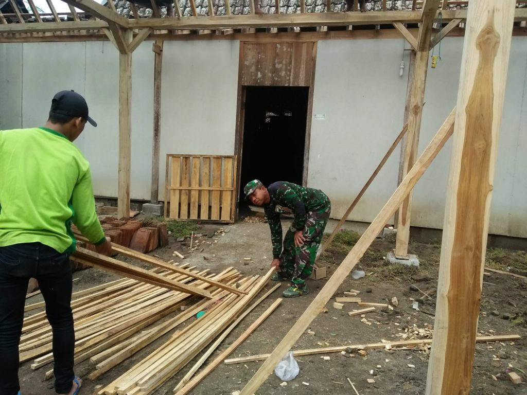 Madiun – Babinsa Desa Ngale Koramil 10/Pilangkenceng, Kodim 0803/Madiun Sertu Agus Supriyanto bersama warga rt 12 rw 02 Desa Ngale, Kecamatan Pilangkenceng, Kab. Madiun bergotong-royong memperbaiki rumah milik bapak Suyadi.