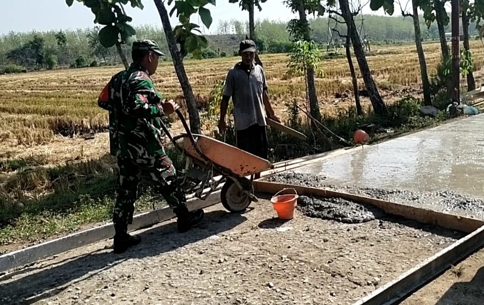 Melihat warga Desa Nglambangan sedang bergotong royong pengecoran jalan akses menuju ke area persawahan, Kopka Andi Rochman selaku Babinsa setempat pun langsung terjun membatu masyarakat.