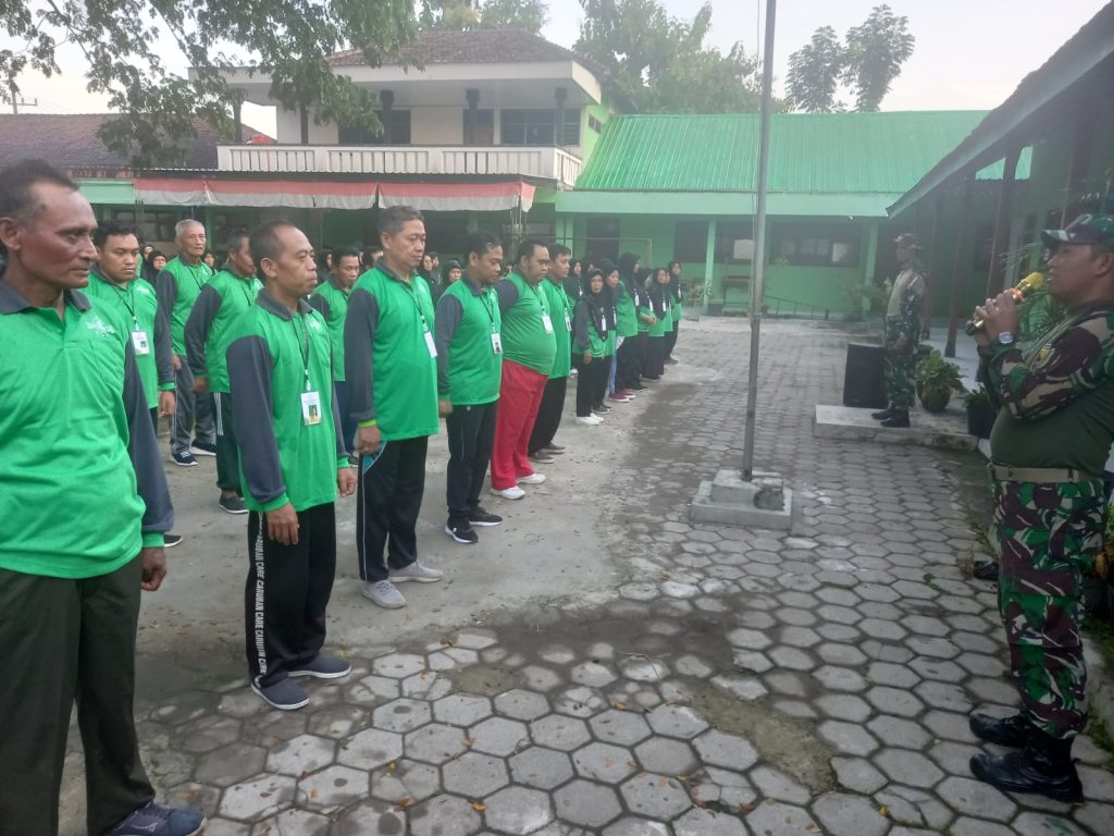 Madiun, – Serda Apriyanto, Babinsa Desa Plumpungrejo, Koramil 0803/16 Wonoasri, Kabupaten Madiun, memberikan pelatihan Peraturan Baris Berbaris (PBB) kepada peserta Pendidikan Dasar Kader Penggerak Nahdlatul Ulama (PD-PKPNU) PCNU Kabupaten Madiun. Kegiatan tersebut dilaksanakan di Pondok Pesantren Al-Basmalah, Desa Plumpungrejo, Kecamatan Wonoasri, Minggu (16/2). Pelatihan ini bertujuan untuk meningkatkan kedisiplinan dan kesehatan para kader NU.