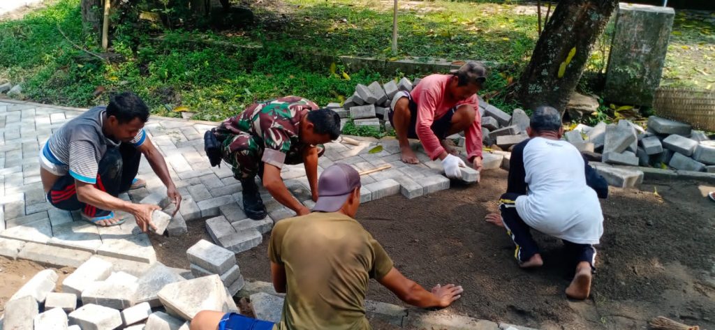 Bersama Warga, Babinsa Pilangkenceng Pasang Paving Jalan Desa.