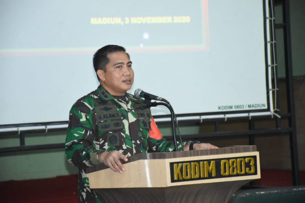Madiun, Komando Distrik Militer (Kodim) 0803/Madiun menyelenggarakan program sosialisasi Penanganan Covid-19 kepada Forkopimcam dalam rangka percepatan penanggulangan Covid-19, di wilayah Kota dan Kabupaten