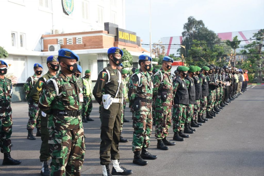Madiun, TNI – Polri bersama Pemerintah Kota Madiun melaksanakan Apel Gelar Pasukan Dalam Rangka Pendisiplinan Protokol Kesehatan (Prokes) Guna Mewujudkan Masyarakat Produktif Yang Aman Dari Covid-19 Di Wilayah