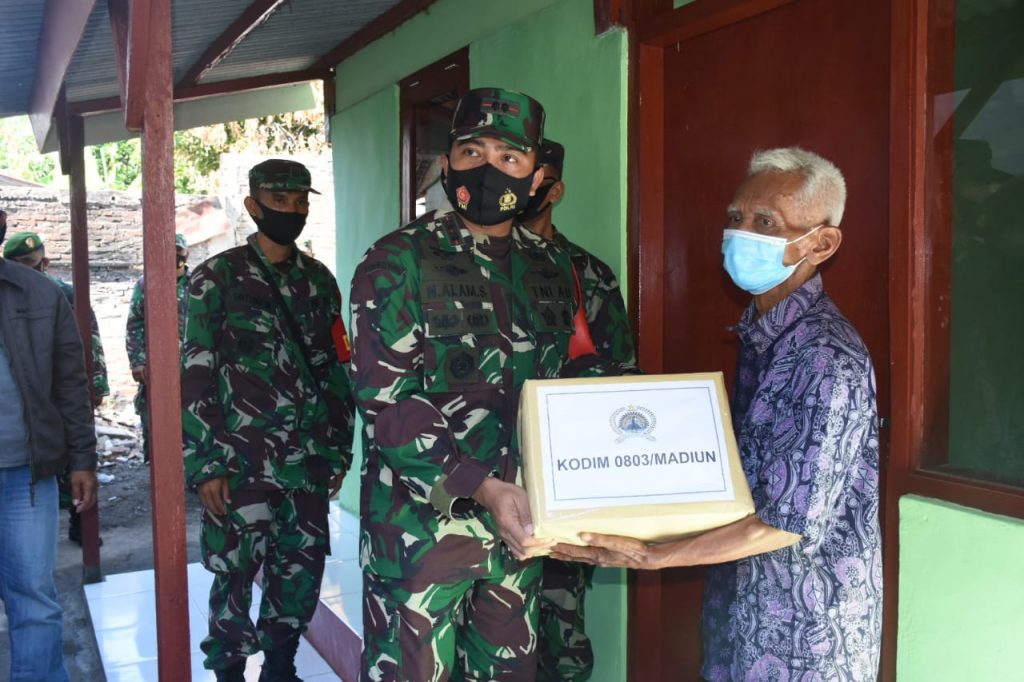 Madiun, Komandan Kodim 0803/Madiun Letkol Czi Nur Alam Sucipto, S.Sos., menyerahkan secara simbolis kunci rumah kepada Pak Ribut (65), warga Jl. Pananggungan Mejayan, Kabupaten Madiun, Sabtu (26/9/2020). Kodim