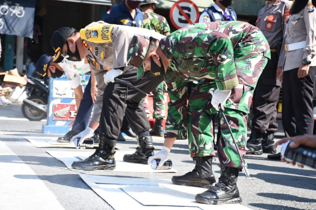 Dandim 0803/Madiun Melaksanakan Pengecetan Marka Jalan Physical Distancing