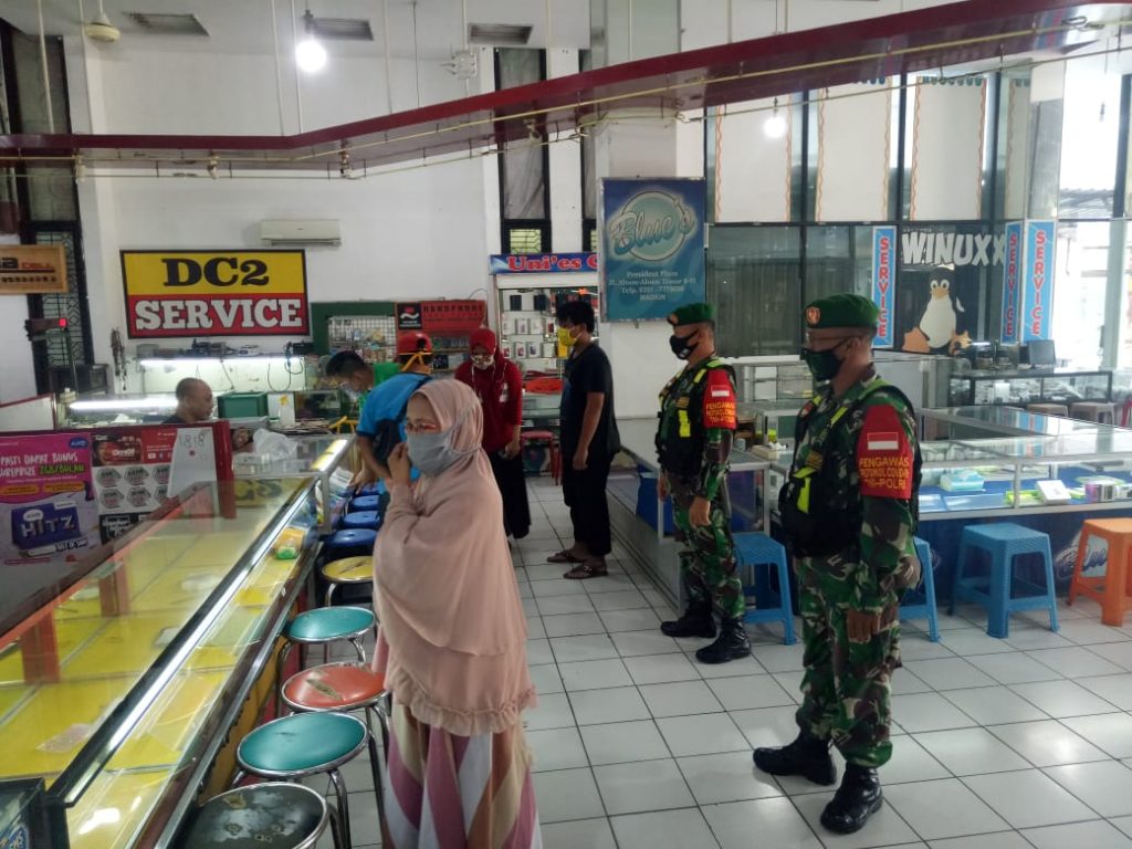 Madiun, Babinsa Koramil 0803/11 Geger, Kodim 0803/Madiun, Sertu Imam Maliki dan Serda Zainul Anwar melakukan sosialisasi New Normal dengan memberikan edukasi kepada pengunjung Mall Presiden Plaza Madiun.